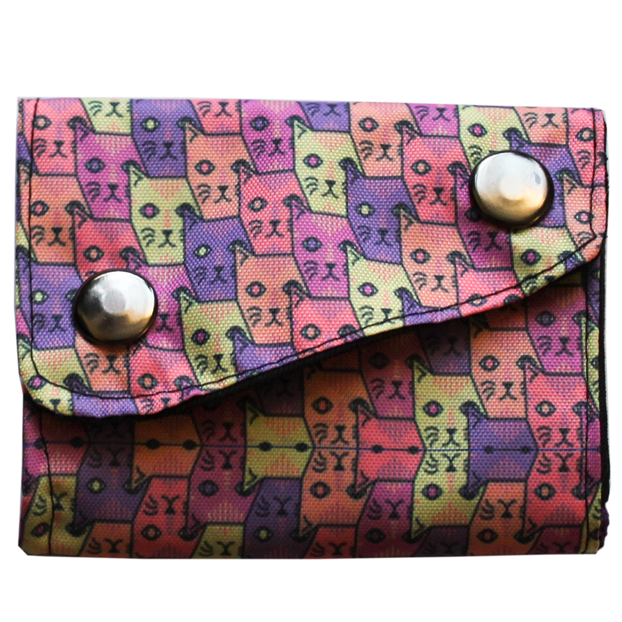 Billetera de gatitos hecha de tela estampada en su exterior y gabardina para su interior. realizada completamente a mano, cuenta con 03 compartimentos internos, para tarjetas, monedas y billetes.