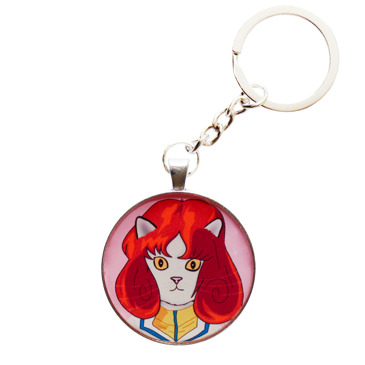 Llavero metálico de gatita Lisa Hayes Robotech. Imagen recubierta con resina. Cuenta con cadena firme para dar seguridad a tus llaves o para ponerlo en el cierre de tu plátano o bolso de mano. Dimensiones aproximadas: 3cm de diámetro.